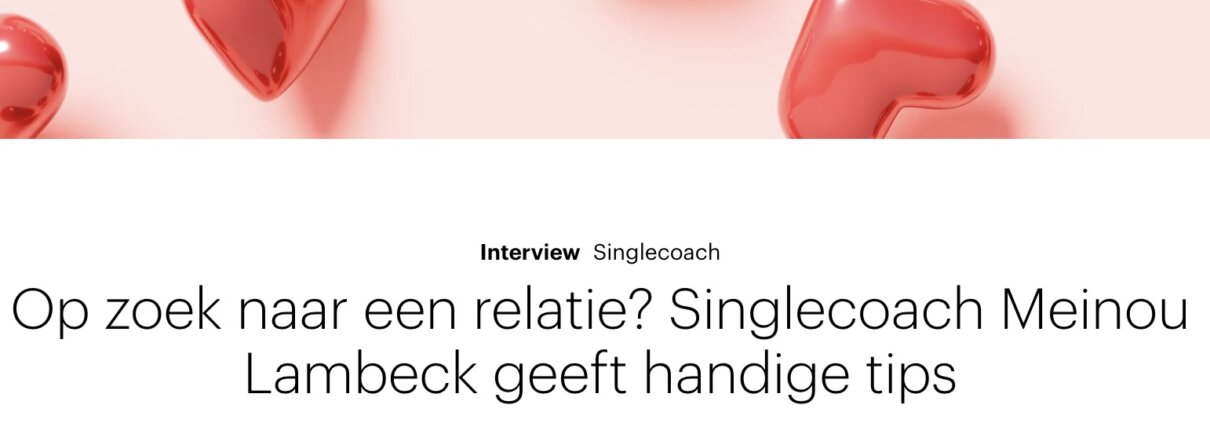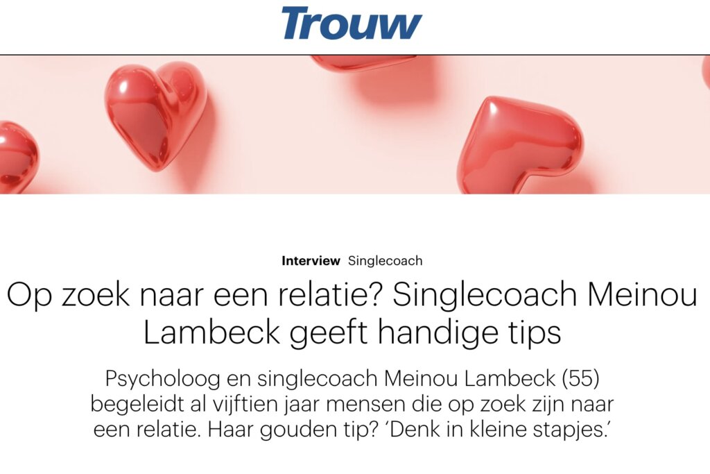 https://singlecoaching.nl/wp-content/uploads/2026/02/Schermafbeelding-2026-02-23-om-13.01.39.jpeg10281542Ellemarie Rietmanhttps://singlecoaching.nl/wp-content/uploads/2023/03/sc-new-2022-logo.svgEllemarie Rietman2026-02-23 08:31:002026-02-23 09:46:57Op zoek naar een relatie? Denk in kleine stapjes. Meinou geeft handige tips in Trouw